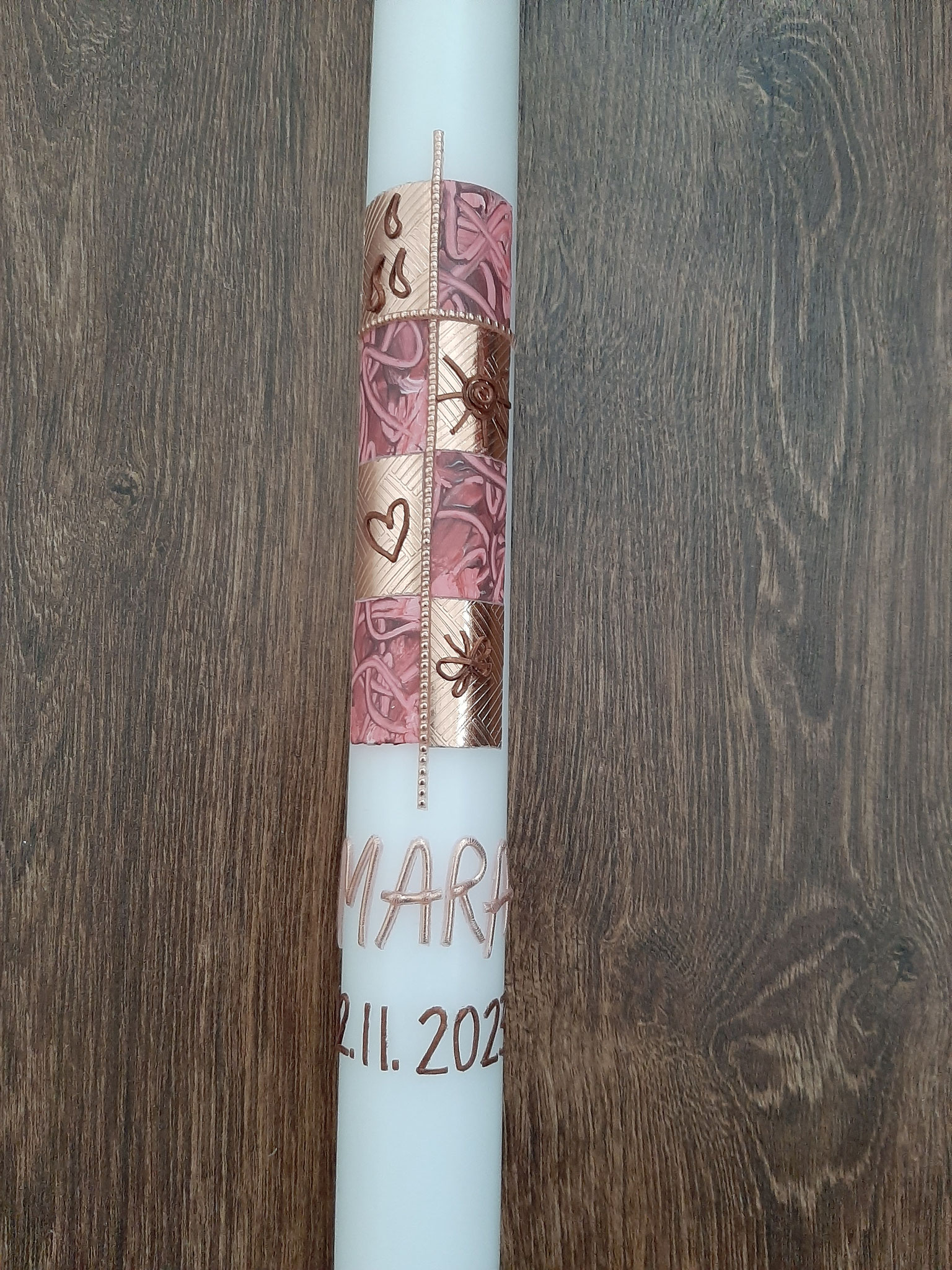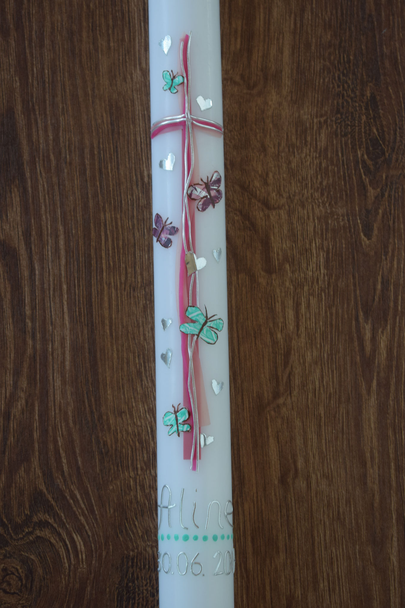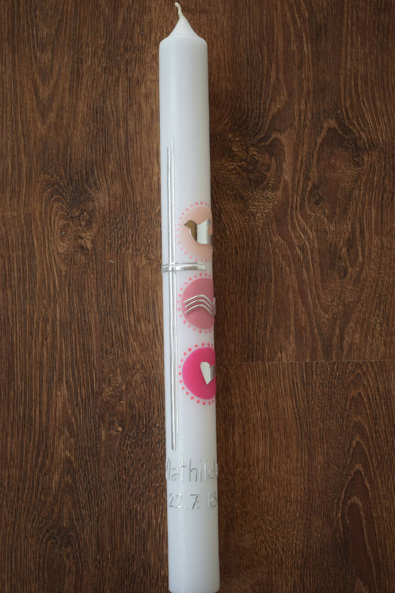 Jede Taufkerze wird mit viel Liebe zum Detail, nach eigenen Entwürfen oder nach Ihrem Wunsch verziert. Mit dem Namen des Täuflings und dem Taufdatum wird die Kerze zur persönlichen Taufkerze.