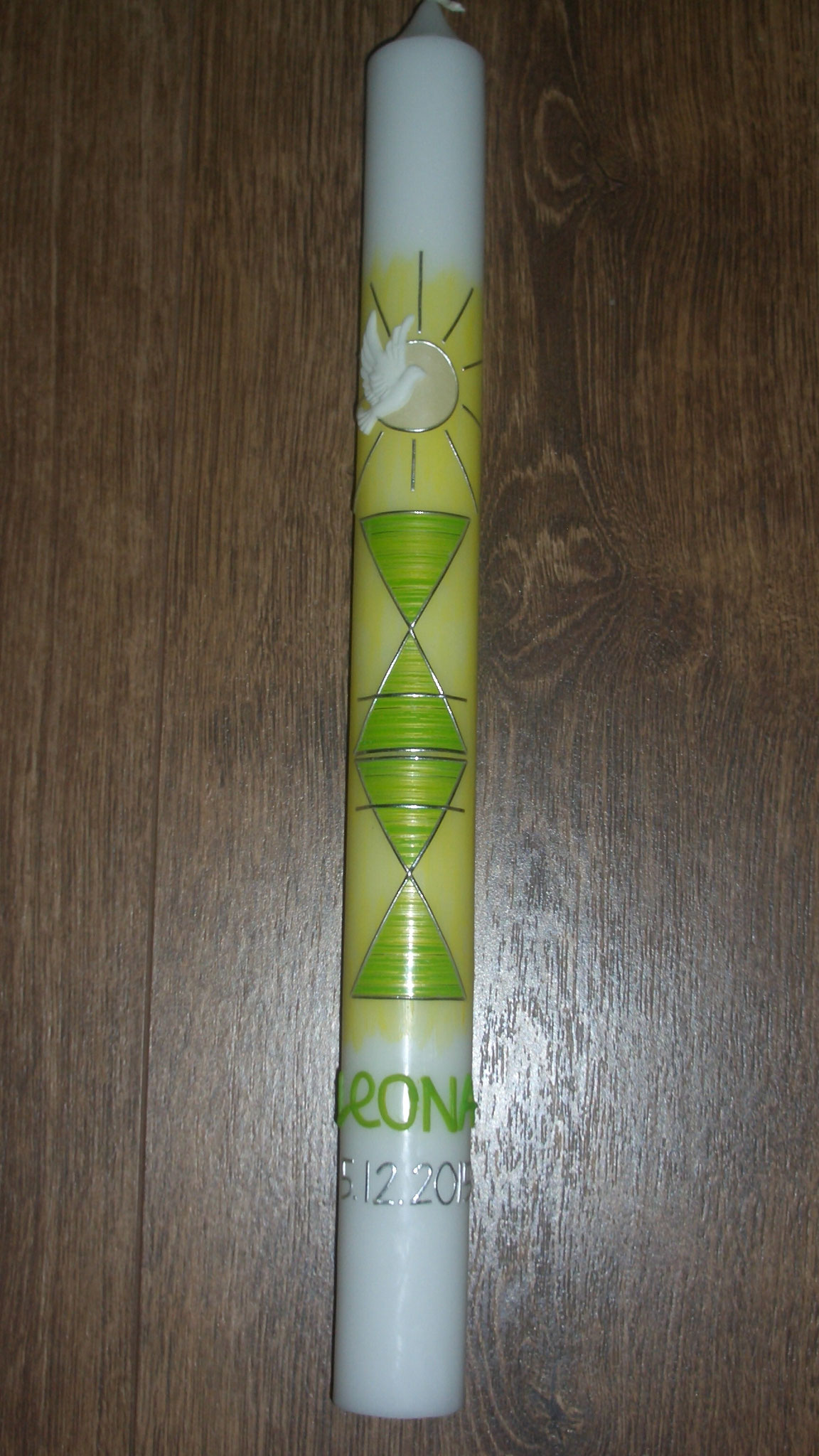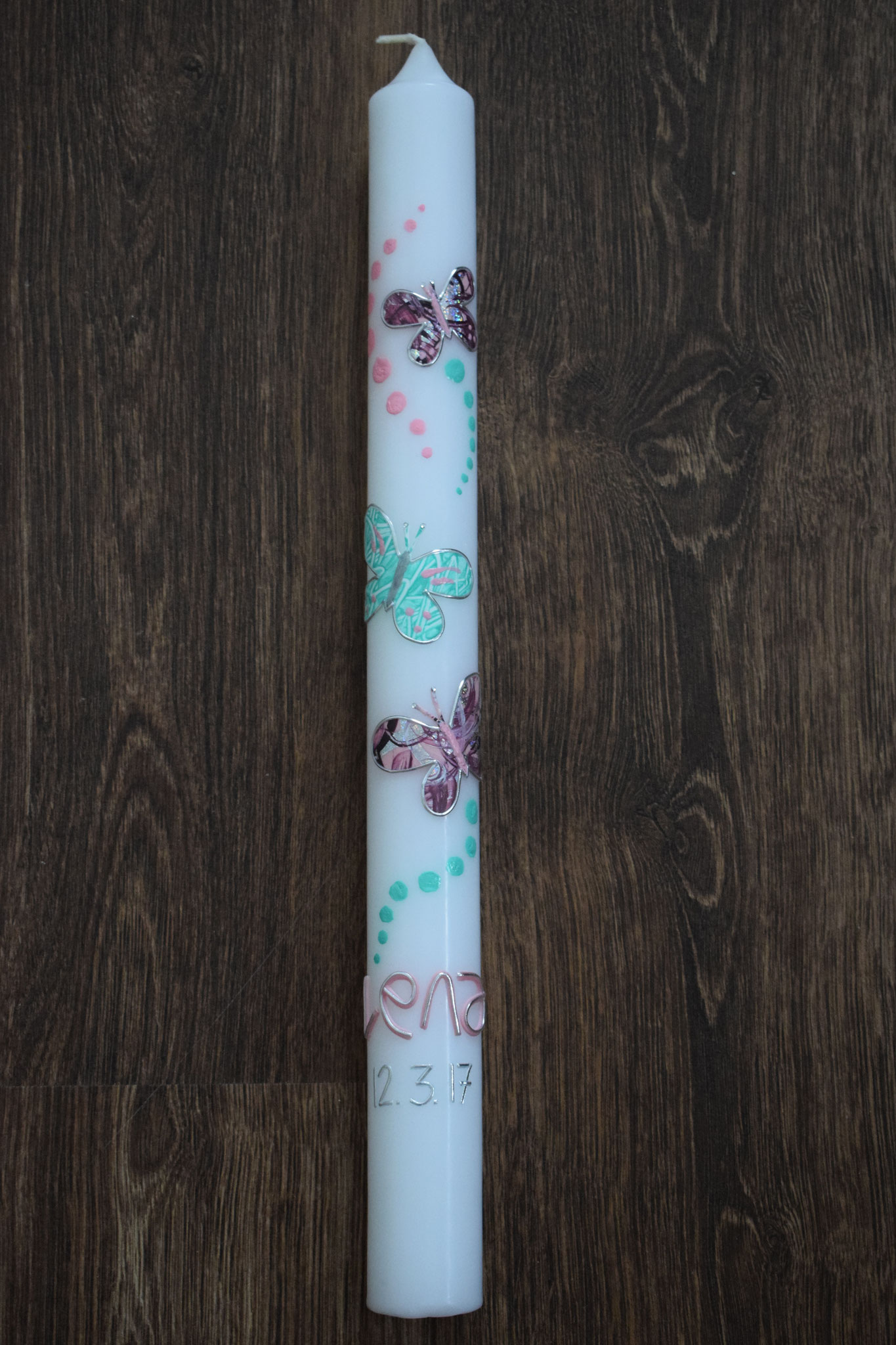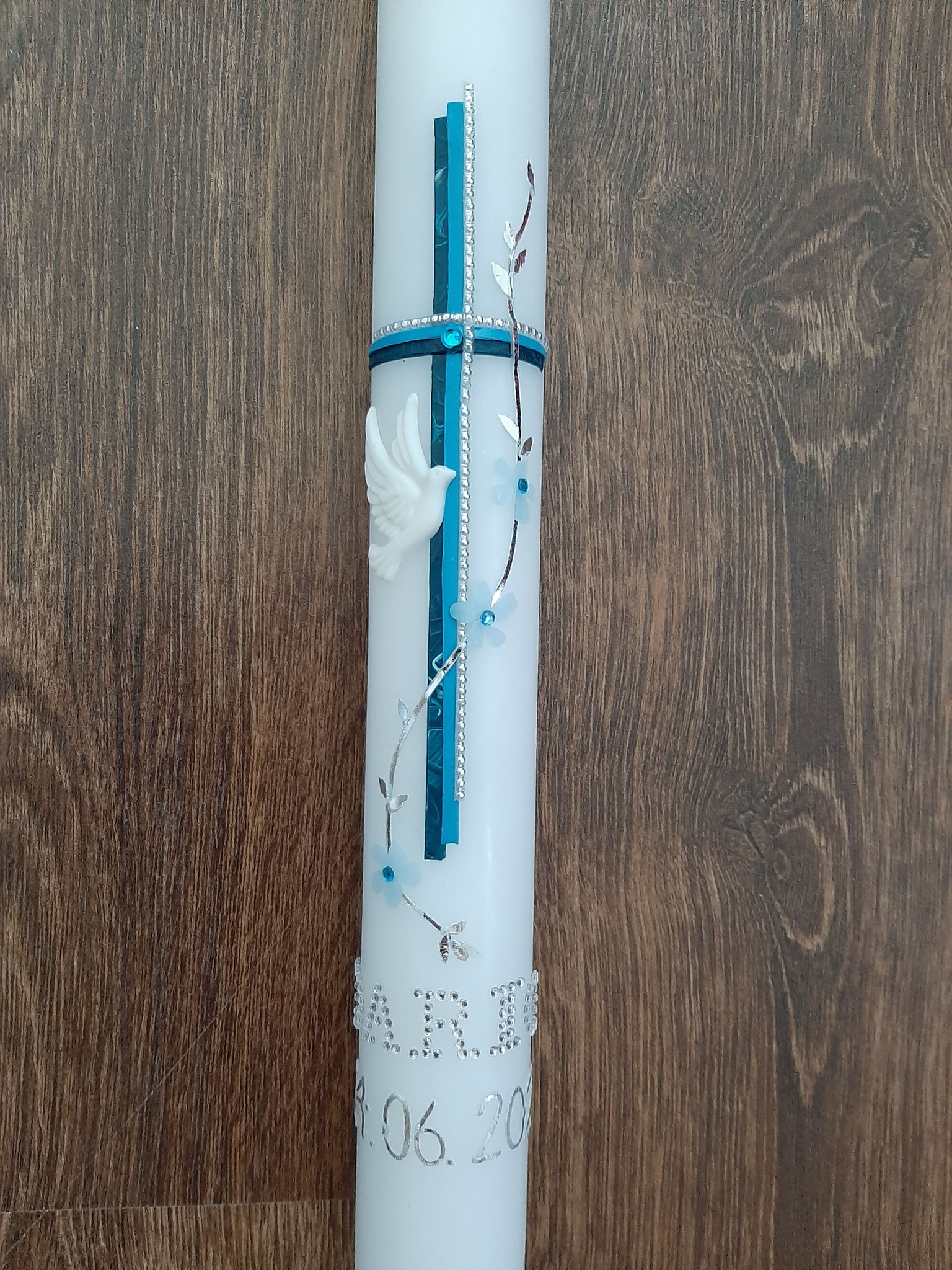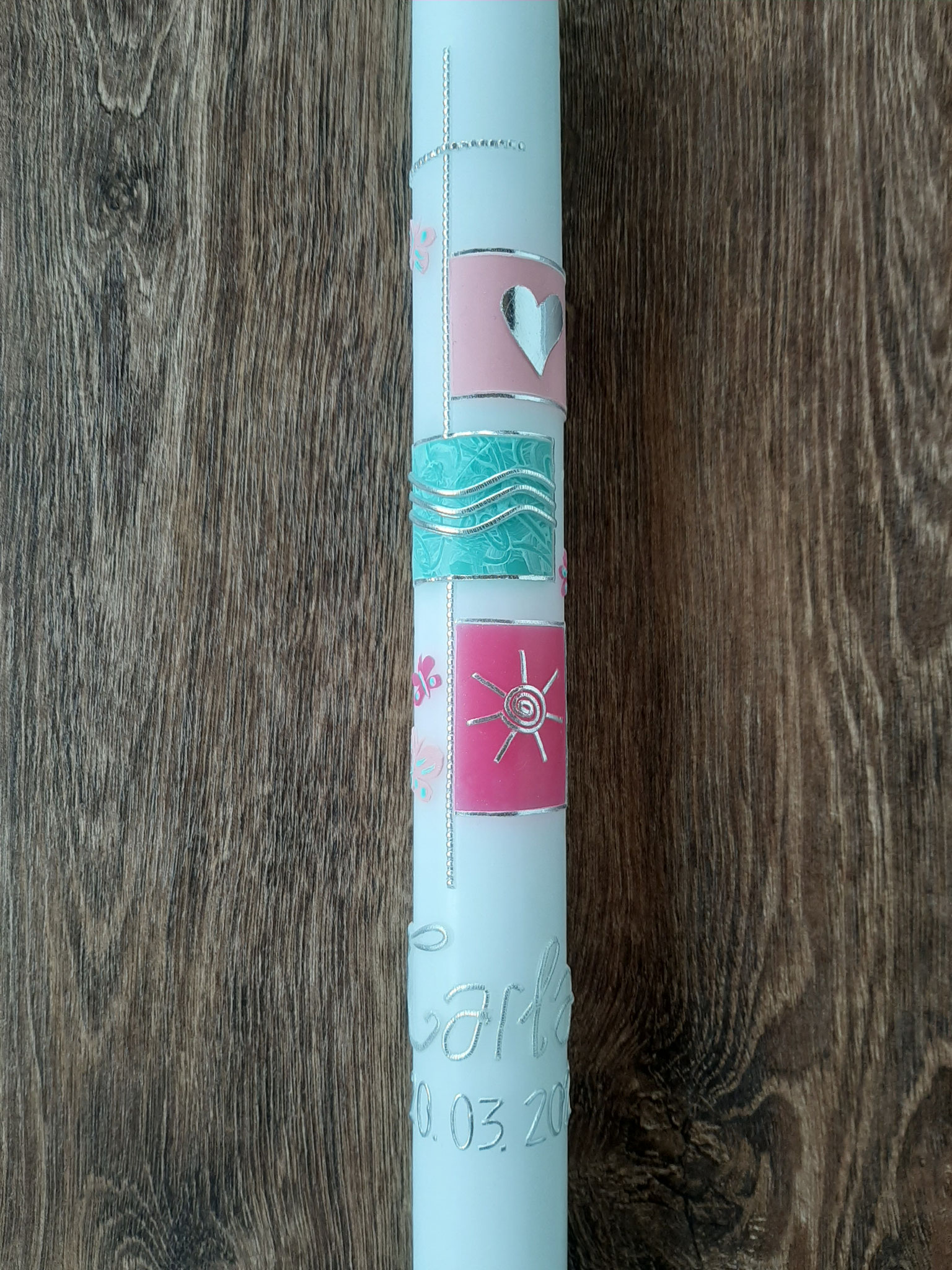 Jede Taufkerze wird mit viel Liebe zum Detail, nach eigenen Entwürfen oder nach Ihrem Wunsch verziert. Mit dem Namen des Täuflings und dem Taufdatum wird die Kerze zur persönlichen Taufkerze.